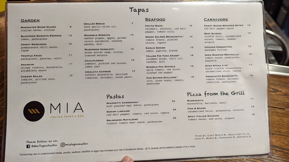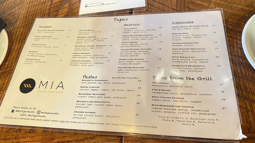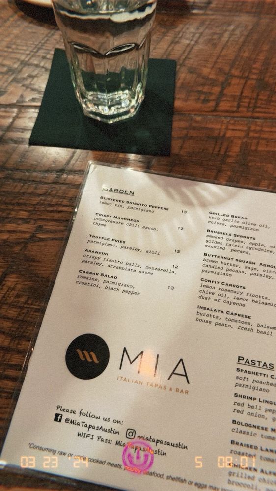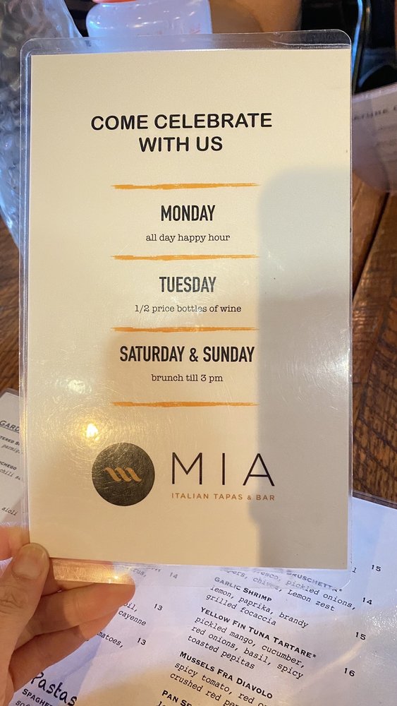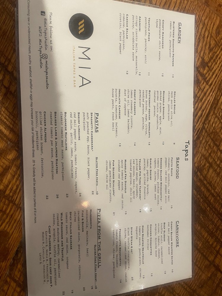 MIA Italian Tapas & Bar Menu