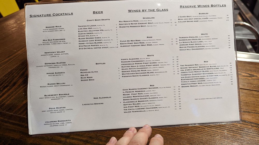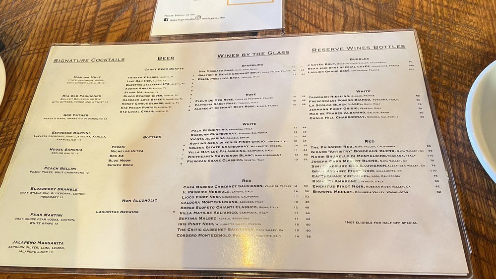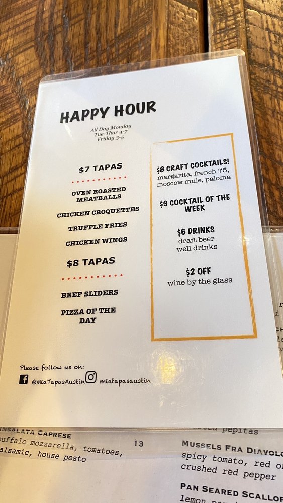 MIA Italian Tapas & Bar is a trendy tapas bar in Austin, TX that offers a variety of Italian dishes with a twist. The menu includes vegan options, making it inclusive for all diners. Customers have praised the flavorful dishes, such as the Steak Hash, Brussel sprouts, carbonara, and chocolate mousse. The restaurant's ambiance is vibrant and perfect for a relaxing evening out. The staff is accommodating and knowledgeable, providing excellent service. The extensive wine selection complements the menu well. Overall, MIA Italian Tapas & Bar is a top choice for those looking for a unique dining experience in the Domain area.